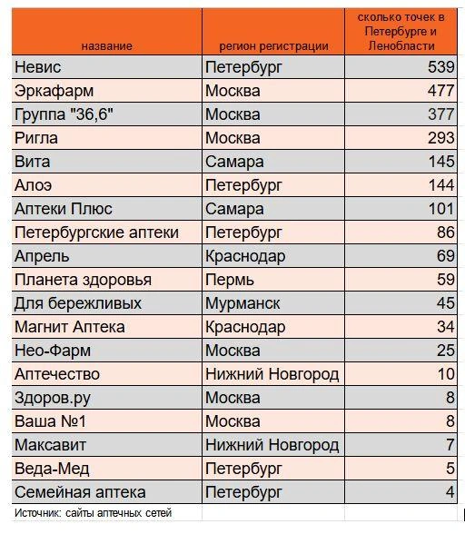Сейчас топ-10 самых крупных аптечных компаний в Петербурге выглядит так: