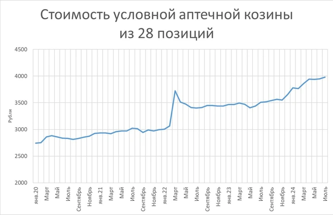 Дорожает всё, и лекарства не исключение, говорят данные Росстата. Собранная «Фонтанкой» корзина из 28 базовых компонентов, от йода и бинтов до корвалола, «Смекты» и «Алмагеля», с начала 2020 года по июль 2024-го подорожала в Петербурге на 45 %, с 2,7 до почти 4 тыс. рублей.