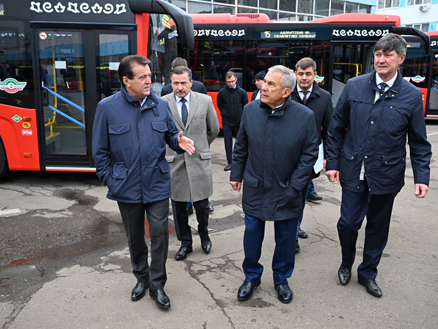 Рустам Минниханов и Ильсур Метшин осмотрели салон, где для комфорта пассажиров имеются мягкие сиденья, кондиционеры, шумоизоляция, кнопка вызова водителя, USB-розетки и противоскользящие чехлы на поручнях. Внимание уделили и удобству маломобильных групп населения: автобусы оснащены аппарелью и местом для инвалидных колясок. Для безопасности людей есть устройство непрерывного контроля токов утечки.