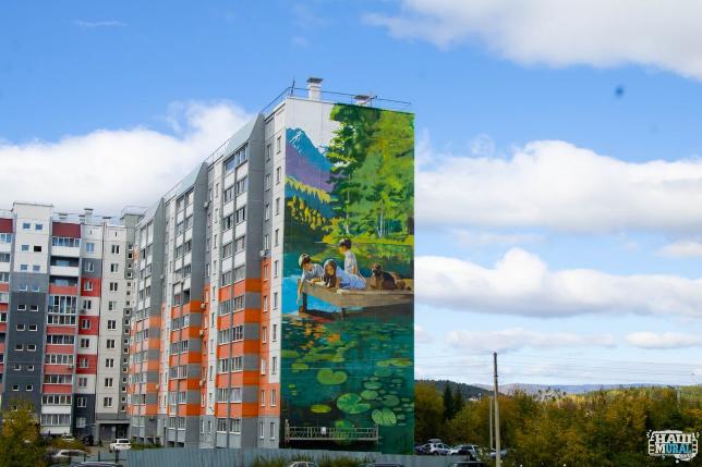 Десятиэтажку украсили красочным граффити, на котором можно увидеть летний день и детей с собакой, отдыхающих на фоне горных хребтов Миасса. Автор идеи — Юлия Сухорукова, а воплотил задумку в жизнь озерский художник-альпинист, дизайнер, 3D-модельер Николай Касаткин.