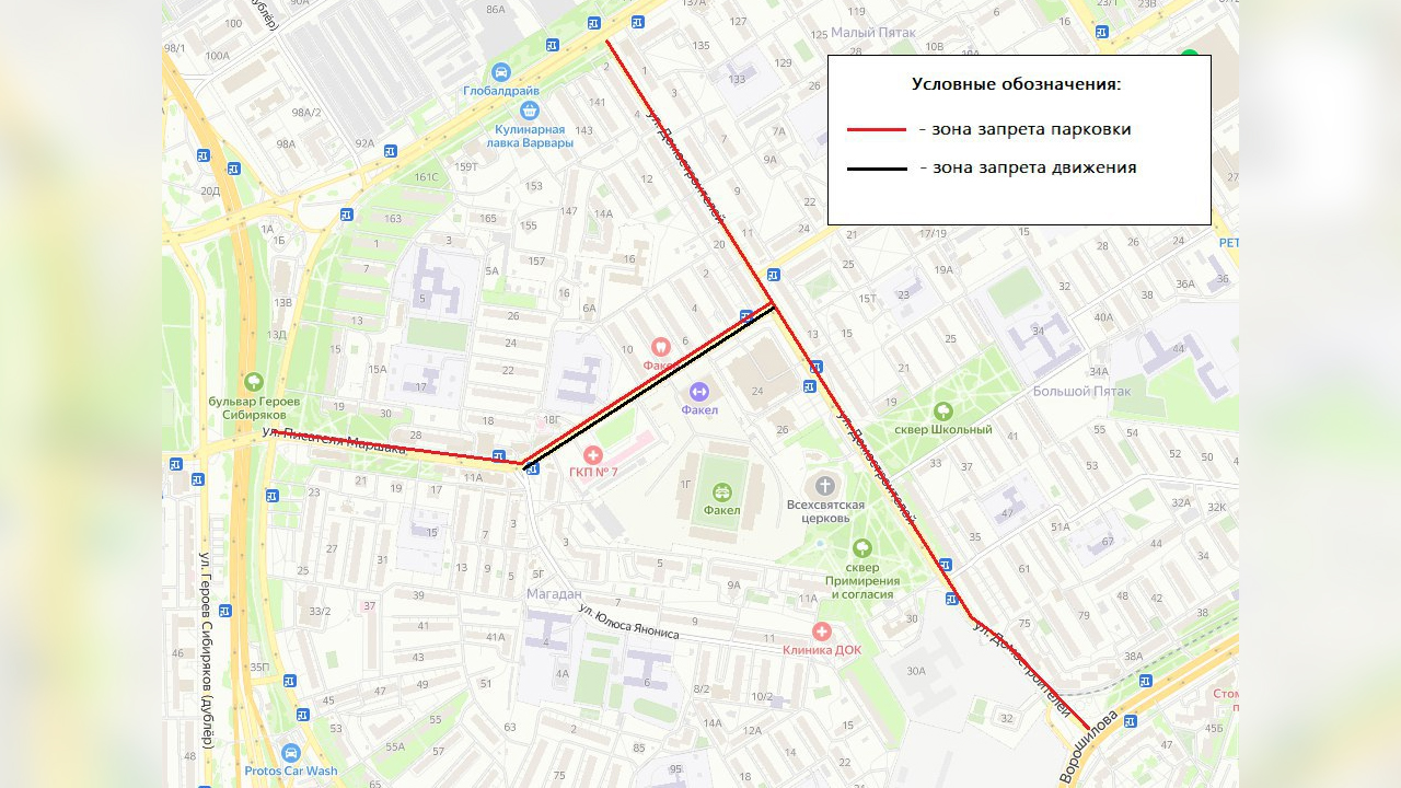 С 18:00 понедельника по 22:00 вторника будет запрещена парковка на улице Домостроителей – от Ворошилова до Пеше-Стрелецкой и Писателя Маршака – от Домостроителей до Героев Сибиряков. С 12:00 вторника проезд перекроют на участке улицы Писателя Маршака – от дома №18а до пересечения с улицей Домостроителей.