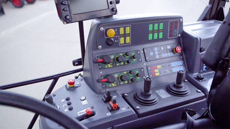 С помощью подлокотника можно выбирать скорость движения, режим работы — транспортный либо рабочий, управлять электронными распределителями расхода гидравлической жидкости, передним и задним навесными устройствами, а также выполнять автоматизацию процессов управления, рассказал заместитель начальника управления конструкторско-экспериментальных работ № 1 по электронике и электрооборудованию Сергей Шматко.