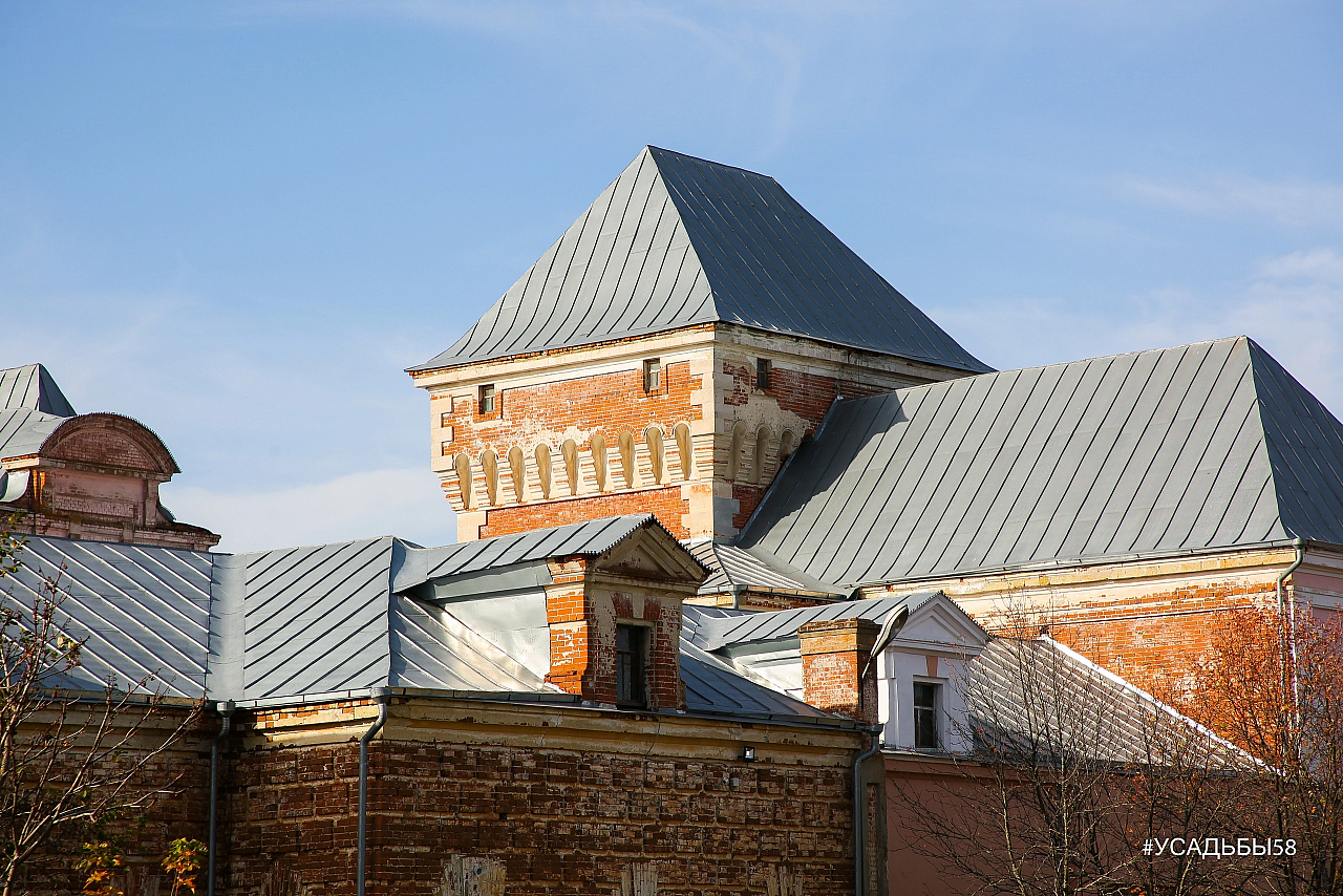 Напомним, усадьба находится в центральной части села Черкасское Пачелмского района на ул. Школьной. Это уникальный особняк. В живописной композиции главного фасада доминирует двухэтажный трехоконный объем под вальмовой крышей, в ризалите которого под картушем располагается вход. К нему вплотную примыкает четырехъярусная прямоугольная башня («донжон») под вальмовой крышей, с разнообразными по формам окнами.