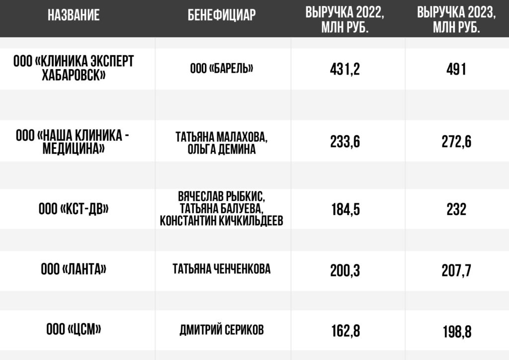 Абсолютный лидер — хабаровский филиал федеральной сети клиник «Эксперт». В 2023 году ООО «Клиника Эксперт Хабаровск» зафиксировала 491 млн рублей выручки и без малого 33 млн рублей убытка.