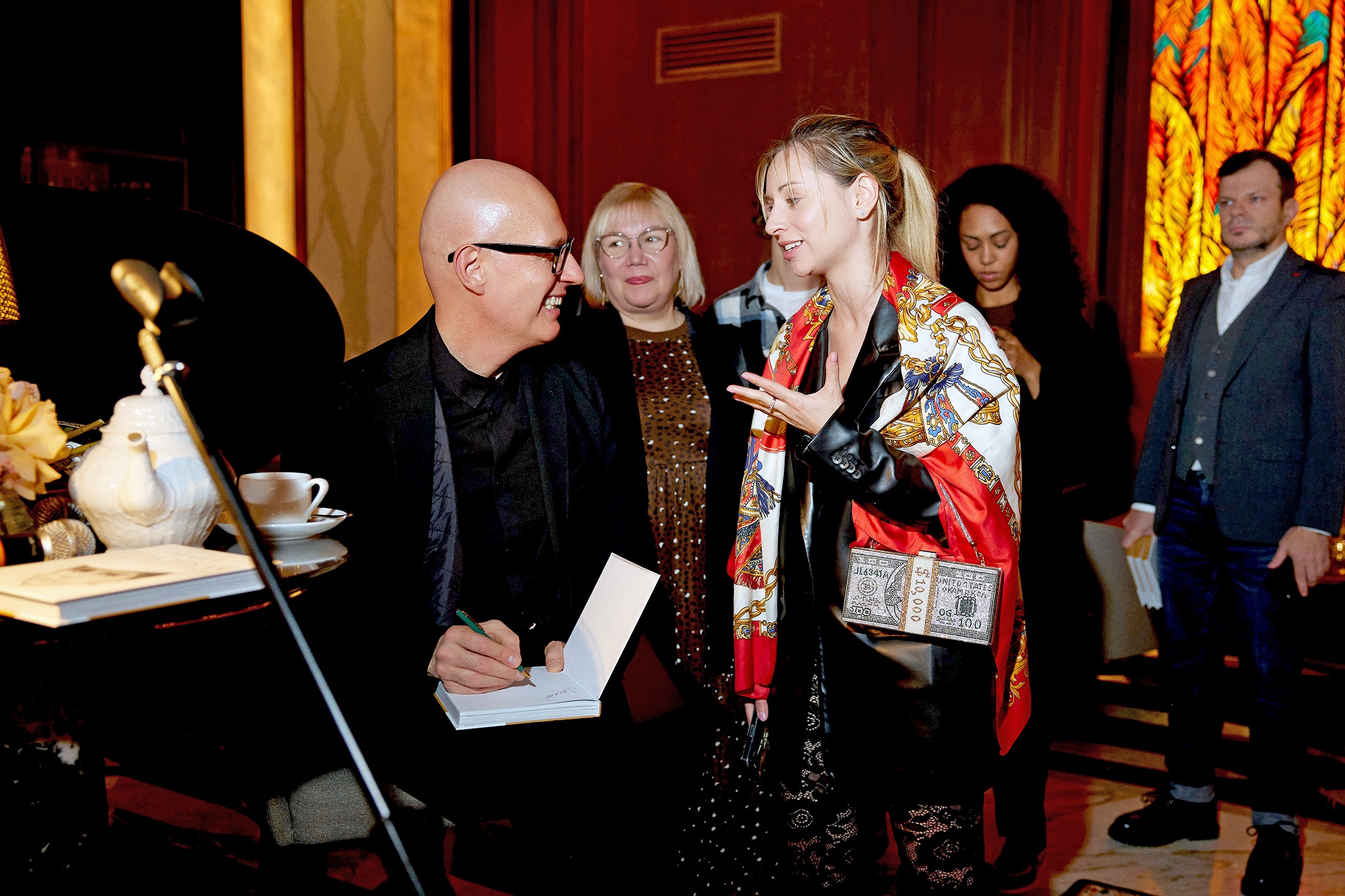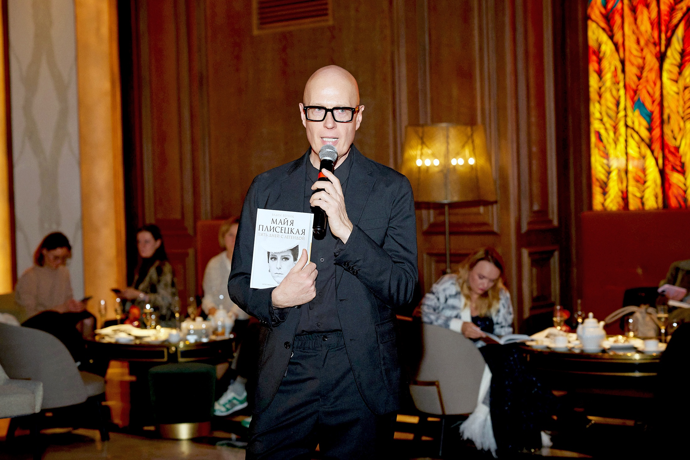 В гранд-лобби отеля, в баре "Шаляпин", вокруг исторического рояля, собрались ценители творчества Майи Михайловны - премьеры и солисты Большого театра Денис Родькин, Элеонора Севенард, Анастасия Меськова, в также Музыкального театра имени Станиславского и Немировича-Данченко Евгений Жуков и Наталья Сомова с супругом Максимом Марининым и сыном Артемом, актер Игорь Верник, художница Мария Янковская, дизайнер Вика Газинская, режиссер и телеведущая Рената Пиотровски, продюсер Анастасия Перова, актеры Владимир Канухин, Тереза Диуро и Александра Киселева и другие. Были и те, кому посчастливилось быть знакомыми с великой балериной. Вадим подписывал книги на память о вечере, благодарил за приглашение и обещал выпустить новый большой фильм о Плисецкой в следующем году, к юбилею балерины. Кроме того, он рассказал о том, что накануне вечера сдал в издательство книгу о Галине Вишневской и Мстиславе Ростроповиче.