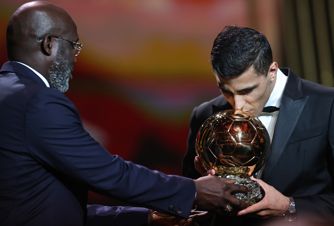Родри получает «Золотой мяч» из рук Джорджа Веа