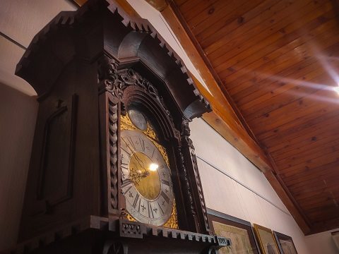Особое место на выставке занимают напольные часы в деревянном корпусе с декором на тему астрономии. Часы были произведены в Западной Европе, предположительно в Дании, после 1881 года. На переднем фасаде за застекленной распашной дверцей находится циферблат. Навершием конструкции является массивный, с выступами, фигурный карниз, имитирующий зубцы крепостной стены. Средняя часть часового шкафа тоже имеет распашную дверцу, которая в свою очередь разделена на три части. Верхнюю часть занимают крупнорельефные фигуры астрономов: Иоганна Кеплера, Николая Коперника, Галилео Галилея. Нижний этаж часового корпуса - массивная тумба. Декор корпуса несет большую смысловую нагрузку. В нем представлены две системы мира: геоцентрическая и гелиоцентрическая. Геоцентризм - устройство мироздания, признающее центром Вселенной неподвижную Землю, вокруг которой вращаются Солнце, Луна, другие планеты и звёзды.