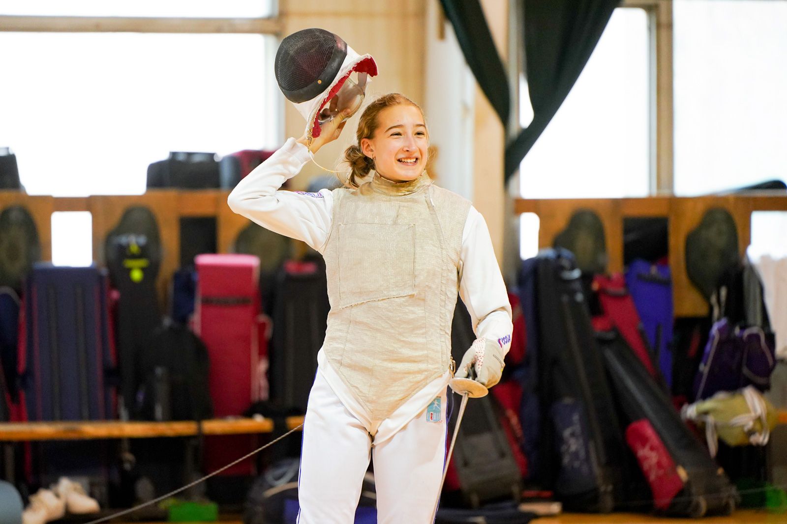 В зале девочка лет 12 сосредоточенно делает разминку перед тренировкой: отжимается, наклоняется, касаясь вытянутой рукой поочередно левого и правого мысков. При этом считает: упражнений должно быть определенное количество, а внимательность, дисциплина и пунктуальность — обязательные качества фехтовальщика.