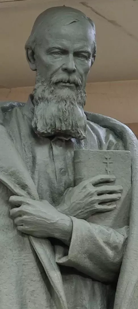Достоевский предстаёт в арестантской шинели, а в одной руке он держат Евангелие.