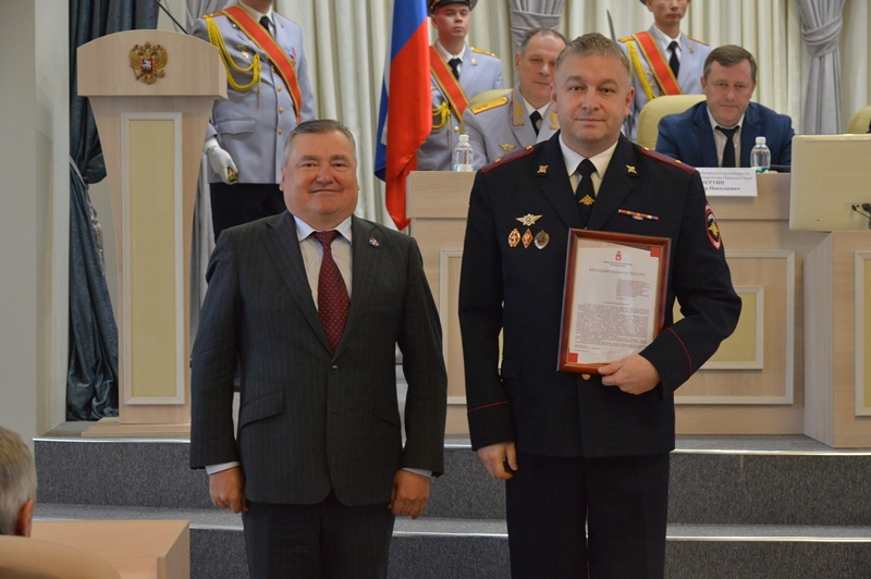 Председатель Законодательного Собрания Пермского края Валерий Сухих отметил активную работу полицейских Прикамья по охране общественного порядка и противодействию преступности и вручил благодарственные письма заместителю начальника Управления организации тылового обеспечения ГУ МВД России по Пермскому краю полковнику внутренней службы Остапу Каткову, начальнику службы отдела мобилизационной подготовки и мобилизации регионального МВД подполковнику полиции Антону Тарновскому, начальнику отделения краевой Госавтоинспекции майору полиции Эльдару Тагирову, старшему инспектору по особым поручениям Управления организации охраны общественного порядка и взаимодействия с органами исполнительной власти субъектов Российской Федерации и органами местного самоуправления ГУ МВД России по Пермскому краю майору полиции Николаю Казанцеву и старшему следователю следственной части СУ УМВД России по г. Перми старшему лейтенанту юстиции Григорию Бердникову.