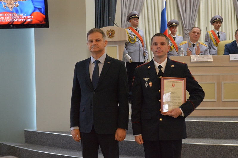 К поздравлениям присоединился исполняющий обязанности Администрации губернатора Пермского края Александр Смертин и провел церемонию награждения благодарственными письмами губернатора Пермского края, которые вручил заместителю начальника Управления организации тылового обеспечения ГУ МВД России по Пермскому краю полковнику внутренней службы Максиму Размыслову, заместителю начальника отдела Управления по вопросам миграции регионального МВД подполковнику полиции Ларисе Перминовой, следователю отдела по расследованию преступлений на обслуживаемой территории Дзержинского района СУ УМВД России по г. Перми старшему лейтенанту юстиции Александре Нечаевой.