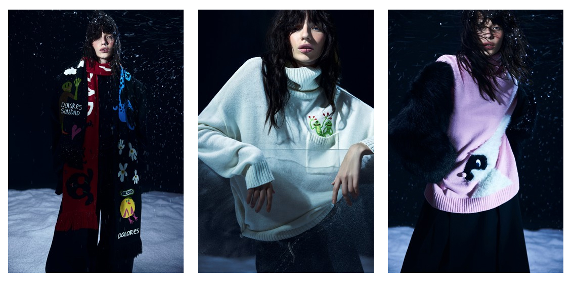 В коллекцию вошли вязаные свитеры, шарфы, шапки, варежки. На изделия дизайнеры перенесли картины Анны: в сюрреалистичных мирах художницы живут придуманные персонажи – собака с гипнотическими глазами, бабочка в сапогах и человек-облако. Дополняют коллекцию блокноты с обложками-картинами и надписью «Ты случайный зритель».