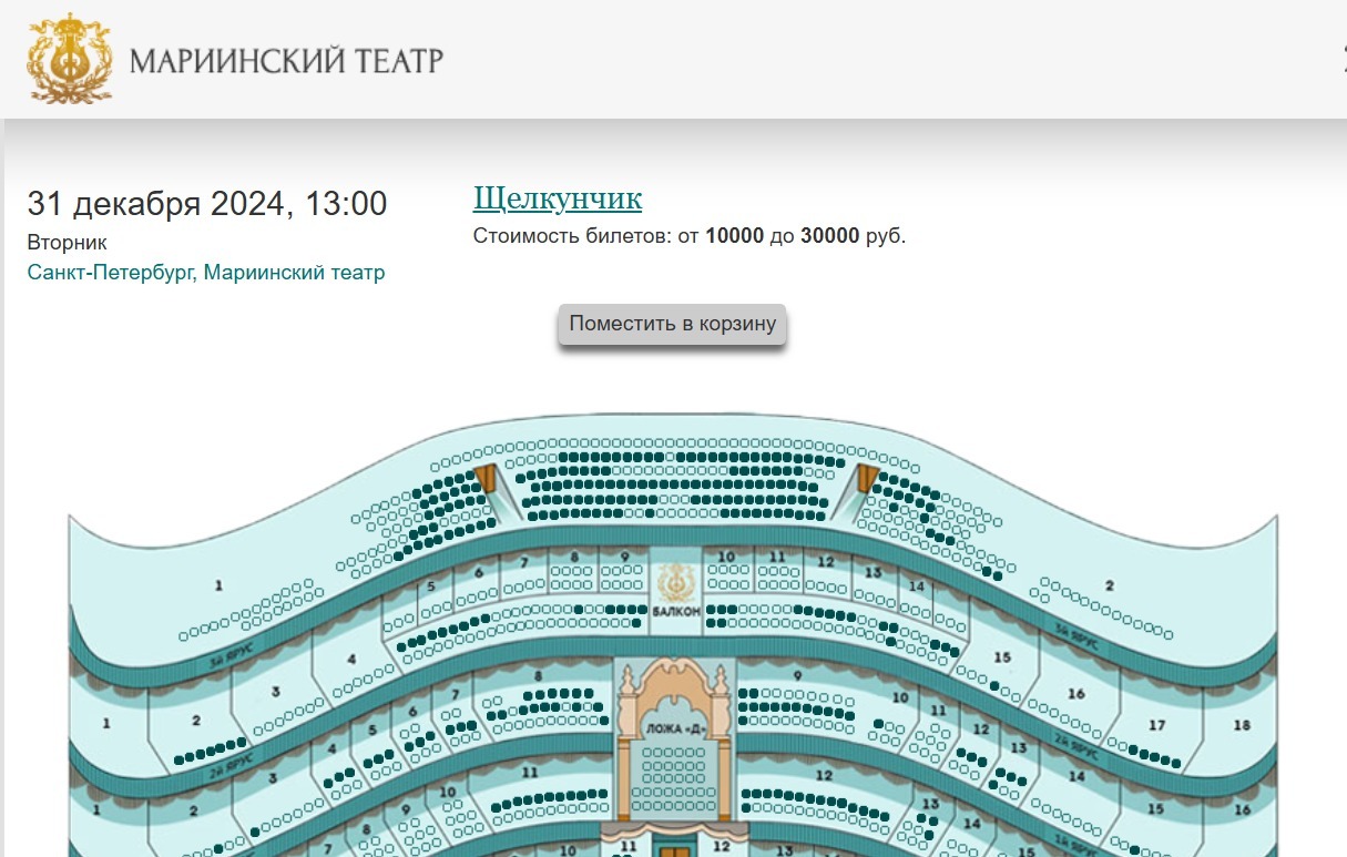 Однако цены «кусались» уже на старте продаж. Так, в Михайловский театр в начале октября цены билетов на «Щелкунчика» стартовали с 3 тысяч рублей. Посмотреть спектакль в первом ряду партера можно было за 20 тысяч, а при желании сделать это 30 декабря за престижные места нужно было заплатить 30 тысяч. Впрочем, как оказалось, это еще не предел: в ноябре их цена достигла 40 тысяч.