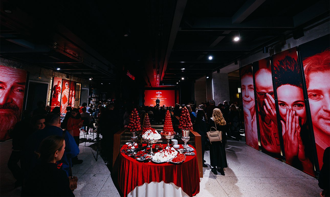 Кстати, вкусности тоже стали частью визуального пространства благодаря еще одному партнеру — компании Елены Смирновой Smile Event Catering, которая украсила фуршетный стол оригинальными конструкциями из красных яблок и печений-ракушек (прямо как на картине Боттичелли «Рождение Венеры») в тех же, фирменных цветах газеты. Спектакль-перформанс, подготовленный к презентации Мастерской Брусникина (режиссер Алексей Мартынов, драматург Егор Зайцев, композитор Родион Аверьянов, продюсер Виктория Шарикова, костюмы — Алина Голод), тоже был решен в оттенках красного и белого. Но, прежде чем актеры появились на сцене, чтобы оживить книгу, свое слово сказали три женщины, аккумулировавшие издательский проект The Art Newspaper Russia. Директор газеты и руководитель проекта Татьяна Сахокия была краткой: она поблагодарила руководство электротеатра, художественного руководителя Бориса Юхананова и директора Ирину Золину, и всю команду и передала слово издателю Ольге Ярутиной, которой и принадлежит идея собрать материалы из газеты в серию книг. Следующие тома будут посвящены другим важным фигурам арт-мира: коллекционерам, директорам музеев, реставраторам и галеристам. В фокусе первого — художники, наши современники.