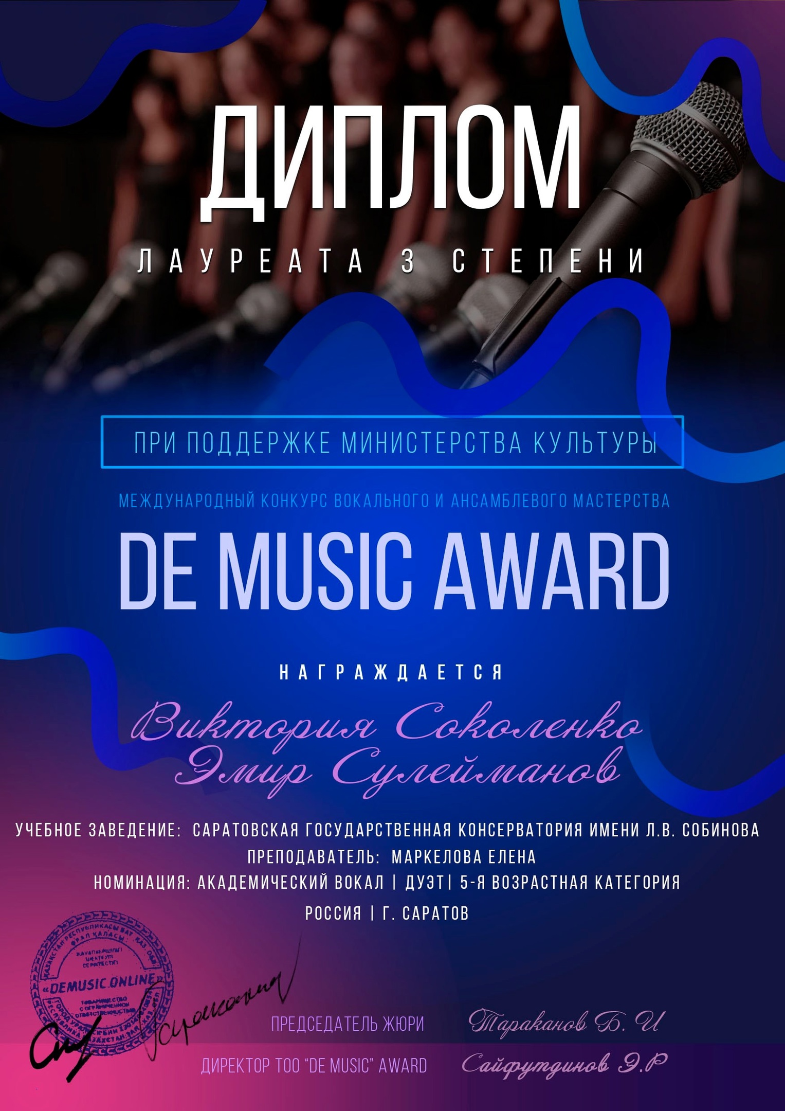 - Лауреат 3 степени в номинации «Дуэт» — Сулейманов Эмир и Соколенко Виктория (класс ансамбля доц. Е. Е. Маркеловой)