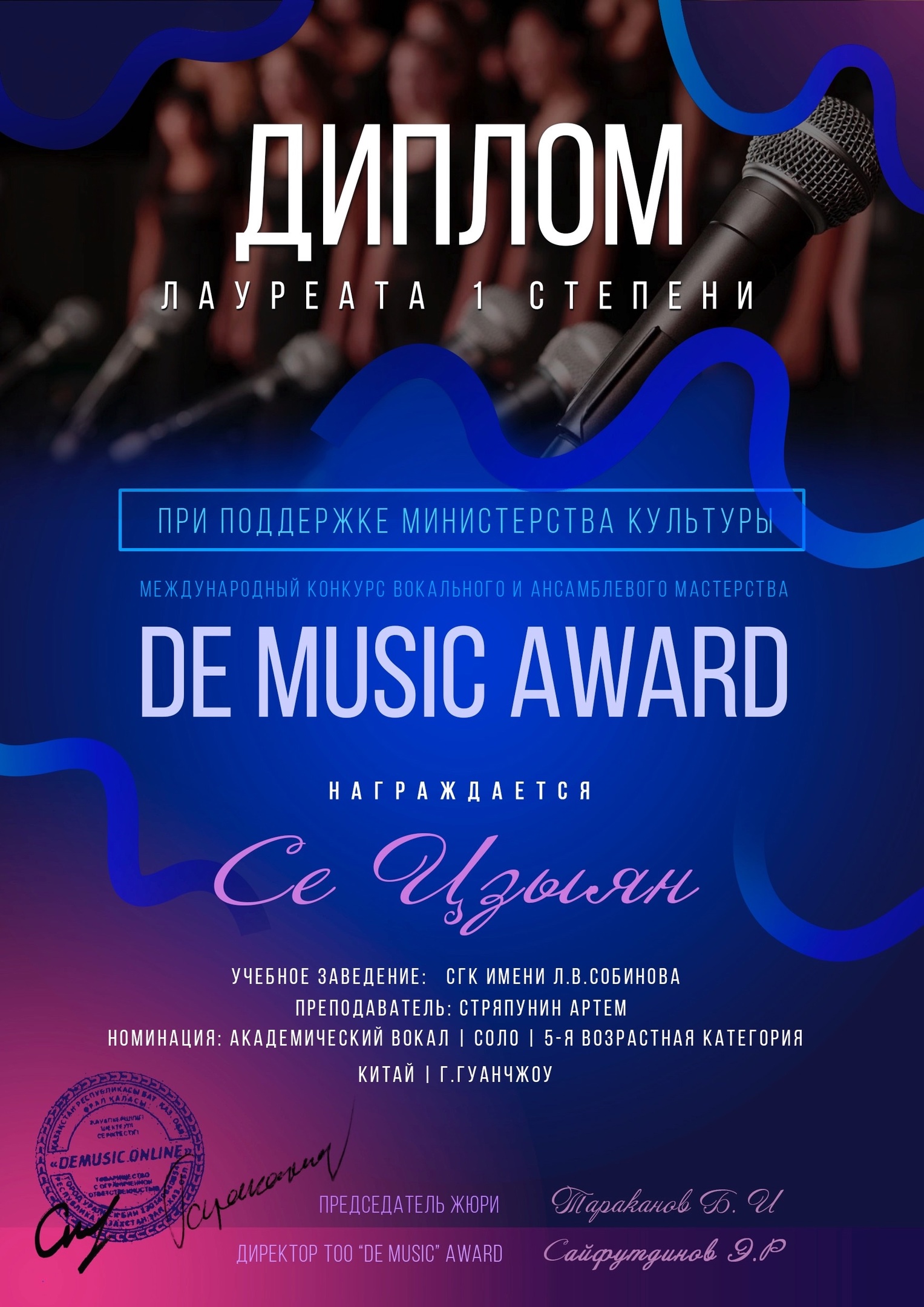 - Лауреат 1 степени в номинации «Сольное исполнительство» — Се Цзыян (класс доц. А.С. Стряпунина)