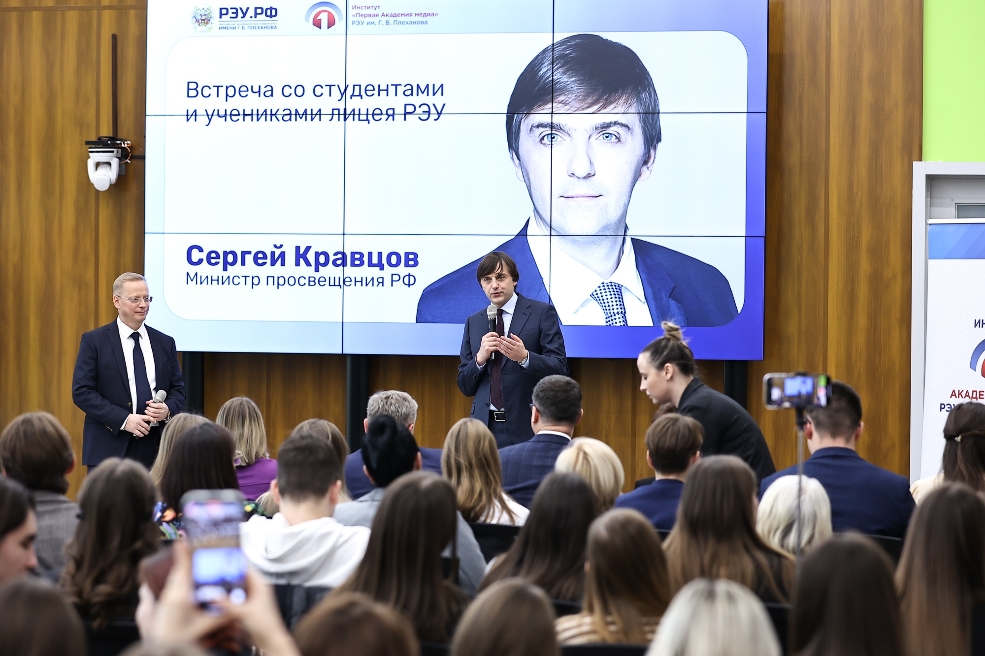 Ректор Российского экономического университета имени Г.В. Плеханова Иван Лобанов вместе с директором института тележурналистом Эрнестом Мацкявичюсом провел Сергею Кравцову экскурсию по новому корпусу вуза, где расположена «Первая Академия медиа». Модератором встречи Министра просвещения РФ со студентами выступил заместитель директора института тележурналист Роман Плюсов.