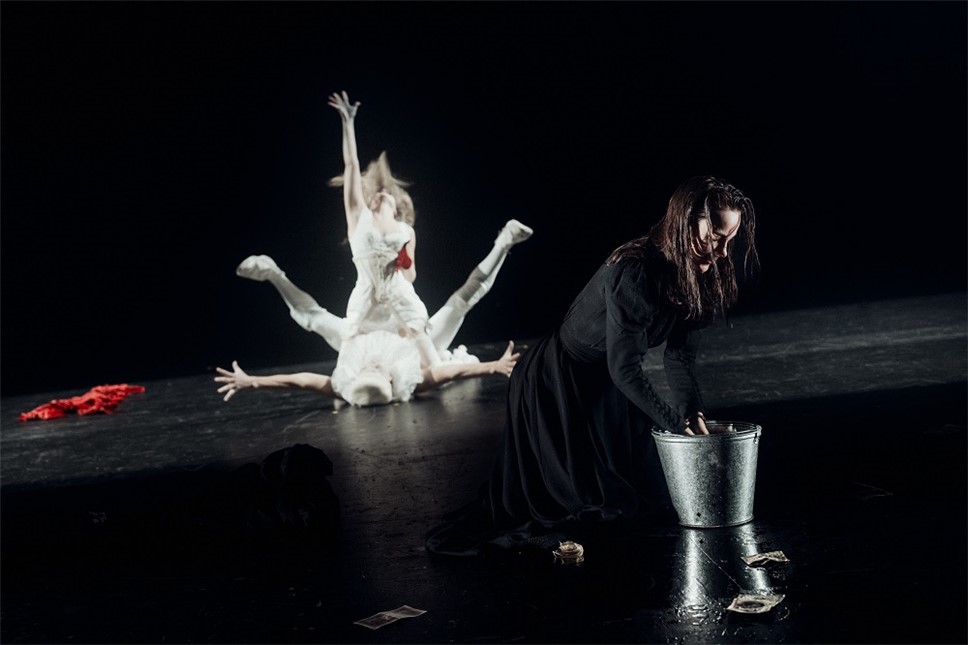 Этот дуэт — ярко-алое крамольное пятно на мрачном фоне. А вся сценография минимальна (Максим Обрезков) и выдержана в гнетущих черно-серых тонах. Из мебели — стол и дюжина венских к стульев, которые то и дело взмывают в воздух в динамичных пробежках и танцах гостей в доме Туркиных. И одежда героев — в тех же черно-серых тонах, сливающаяся с фоном (Евгения Панфилова).