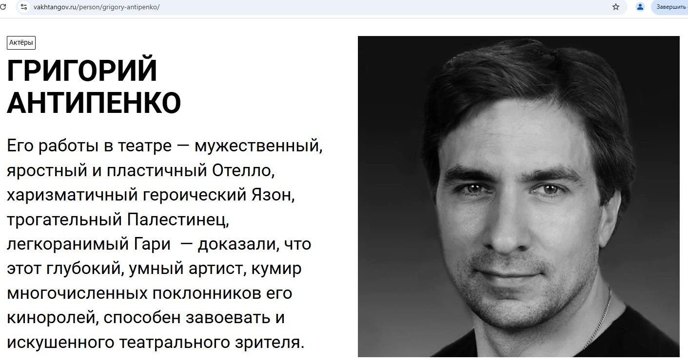 Персональная страница Антипенко на официальном портале театра имени Вахтангова. Скриншот: интернет-сайт vakhtangov.ru