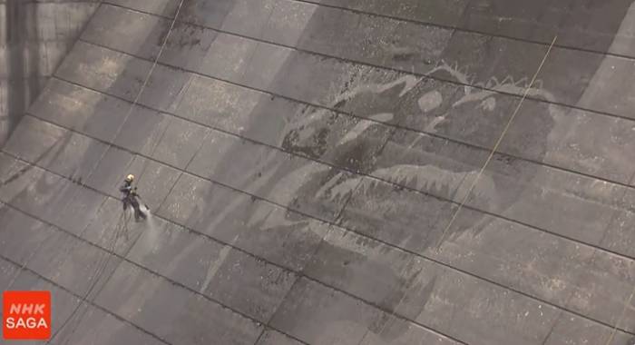 Необычный арт-объект создала компания по производству уборочного оборудования. Ее сотрудники, виртуозно используя мощные мойки высокого давления, «нарисовали» огромный силуэт Годзиллы на плотине Ивая-Каваучи в японской префектуре Сага.