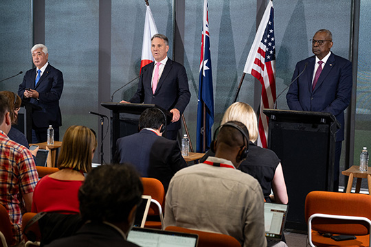 Главы оборонных ведомств США (Ллойд Остин) и Японии (Гэн Накатани) 17 ноября были приняты своим австралийским визави (Ричард Марлз) в городе Дарвин, который расположен на севере Австралии. В выборе места для трёхсторонних переговоров открыто присутствует символизм: город-порт Дарвин смотрит в направлении Южно-Китайского моря. К слову, в годы Второй мировой войны город сильно пострадал от японских бомб. Но сегодня и японцы, и австралийцы имеют общего геополитического куратора в лице Вашингтона. При этом США и Австралия являются, наряду с Великобританией, учредителями Стратегического партнёрства AUKUS. Япония не рассматривалась в качестве полноценного участника этой организации, но в AUKUS проявляют интерес к привлечению Токио в качестве так называемой «Второй опоры» AUKUS. Данный трек предполагает военную кооперацию участников Стратегического партнёрства по проектам, которые не затрагивают его наиболее чувствительную сферу - поставку для Королевского военно-морского флота Австралии американских подлодок с атомными энергетическими установками (минимум трёх) и передачу технологий строительства таких лодок уже силами самой Австралии. В частности, на встрече в Дарвине Ллойд Остин и Ричард Марлз заявили, что они «с нетерпением ожидают продолжения консультаций с Японией по проекту создания морских автономных систем», что подходит под критерии «Второй опоры»[1]. Впрочем, в мае группа сенаторов США, состоящая преимущественно из республиканцев, потребовала на законодательном уровне уточнить детали участия Японии в AUKUS, что объяснялось возможными уязвимостями системы экспортного контроля Японии и защиты от киберугроз[2].