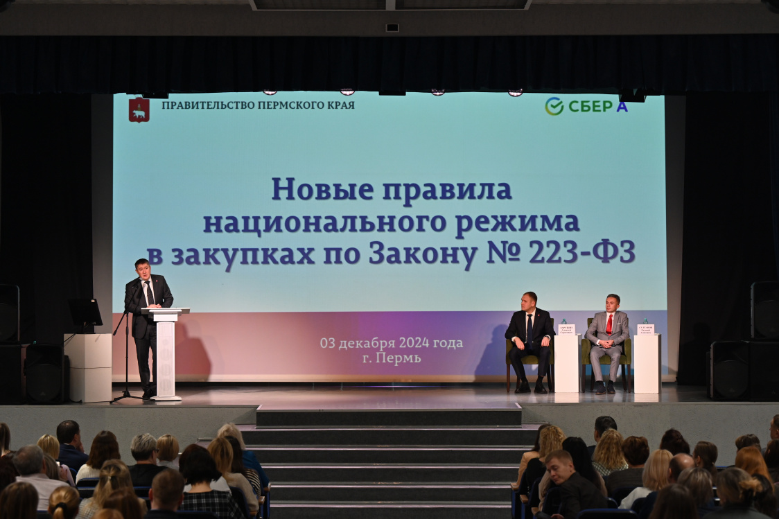 Сегодня, 3 декабря, проходит очное обучающее мероприятие для заказчиков Пермского края на тему «Новые правила национального режима в закупках по Закону № 223-ФЗ». Оно организованно Министерством по регулированию контрактной системы в сфере закупок Пермского края при поддержке Правительства Пермского края и АО «Сбербанк-АСТ». Участники семинара обсудили новые правила национального режима о закупках, которые вступят в силу с 1 января 2025 года.