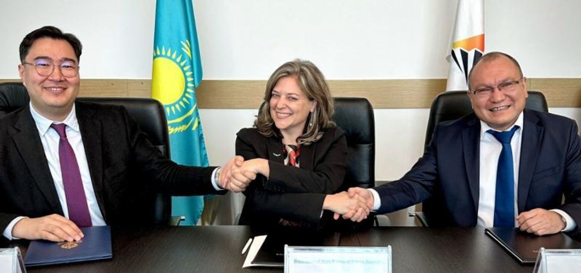 Председатель Правления АО "НГК "Тау-Кен Самрук" Бакыт Чирчикбаев, Заместитель Помощника Государственного Секретаря Бюро энергетических ресурсов Государственного Департамента США Кимберли Харрингтон и Председатель Правления АО "Национальная Геологическая Служба" Ерлан Галиев.