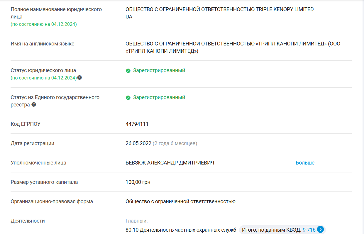 Основной задачей украинского филиала американской ЧВК указана «деятельность частных охранных служб», а также «обслуживание систем безопасности». Руководит украинским филиалом Triple Canopy Александр Дмитриевич Бевзюк, солдат 3-й отдельной штурмовой бригады ВСУ (3-й ОШБр). Сформирована бригада на основе подразделения, состоявшего из боевиков запрещённой в России экстремистской организации «Азов»*.