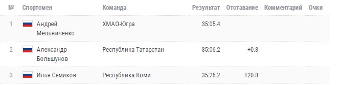 Четвёртое место досталось Павлу Соловьёву из Красноярского края/Мурманской области (+21,5 секунды), а пятое и шестое - Артёму Мальцеву из Тюменской области и Антону Тимашову из Республики Татарстан — у обоих +32,4 секунды.
