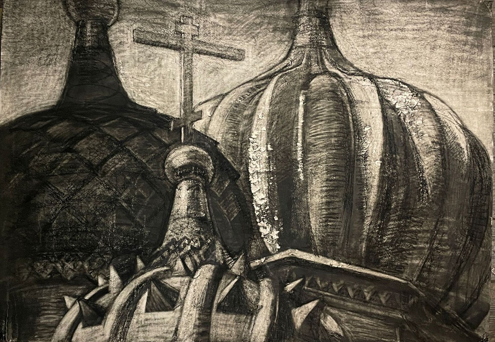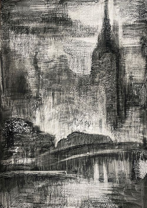 Умит Бек (Надежда Курбанбаева) представила на выставку графические работы на больших листах бумаги. В ее архитектурных пейзажах, выполненных соусом (инструментом для рисования в виде толстого карандаша), столица предстает таинственным городом, готовым вот-вот раствориться в летних сумерках.