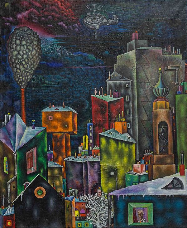 Для Александра Юликова, представителя старшего поколения московских художников, на протяжении более чем 60 лет остается актуальной тема взаимодействия человека и мегаполиса. В его городе, словно в геометрическом пространстве, человек представляется зажатым тесным кольцом многоэтажек, где окна смотрят в глаза друг другу, как люди. Традиции поставангарда поддерживают и другие участники выставки — скульпторы Ольга Хан и Владимир Пельдяков. Ольга комбинирует реалистические формы с геометрией, применяет разные материалы. Владимир Пельдяков создал целую коллекцию крупных конструктивных и плоскостных объектов, соединив дерево, керамику, эпоксидную смолу и другие материалы.