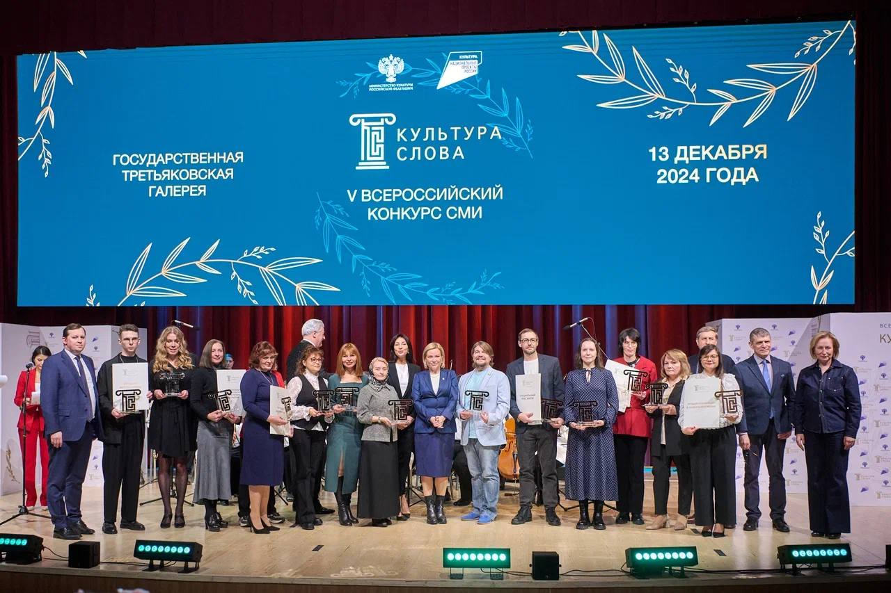 Церемония награждения победителей V Всероссийского конкурса СМИ «Культура слова», учрежденного Минкультуры России, состоялась 13 декабря 2024 года в Москве. Мероприятие прошло на площадке Третьяковской галереи на Кадашевской набережной. «Порой бывает непросто убедить редактора в важности материала на тему культуры. Поэтому хочется обратить внимание и поблагодарить наших коллег из разных регионов, которые делают все, чтобы как можно больше людей узнали о позитивных изменениях в нашей отрасли. На конкурс было подано более 700 проектов из 75 регионов. С нами впервые – талантливые журналисты из Донецкой и Луганской народных республик. Мы счастливы, что вы наконец-то можете писать хорошие новости о культуре. Мы так рады, что вы становитесь победителями, и благодарны вам, что вы сохранили русский язык и русскую речь», – сказала Министр культуры Российской Федерации Ольга Любимова. В 2024 году на конкурс было подано 732 работы от авторов из 75 регионов России, впервые в конкурсе также приняли участие журналисты из ДНР и ЛНР. Жюри выбрало лучшие работы в 10 номинациях, также была присуждена специальная премия Министра культуры Российской Федерации – ее получила журналистка из Донецкой Народной Республики Клевцова Елена Васильевна, которая работает корреспондентом в Харцызской городской газете «Родина (ДНР)». Победители в номинациях: • Номинация «Лучшее интервью» – Пиджакова Маргарита Владиславовна, МАУ «Редакция газеты «Знамя Победы», г. Сухой Лог (Свердовская обл.); • Номинация «Лучшая печатная публикация» – Баранова Татьяна Михайловна, журнал Самарской губернии «ПЕРВЫЙ в бизнесе и власти», г. Самара; • Номинация «Лучший видеосюжет» – Калачев Александр Александрович, телеканал «Югра», г. Ханты-Мансийск; • Номинация «Лучшая публикация в онлайн-издании» – Обухович Иванна Алексеевна, единый региональный портал «Культура 38», г. Иркутск; • Номинация «Лучший радиовыпуск» – Джабраилова Лариса Сайпудиновна, ГБУ ЧГТРК «Грозный», г. Грозный; • Номинация «Лучший видеоподкаст» – Каминская Татьяна Александровна, ГТРК «Волгоград-ТРВ», г. Волгоград; • Номинация «Наша культура в лицах» – Харитонова Инна Александровна, Государственный исторический музей-заповедник «Горки Ленинские», р. п. Горки Ленинские; • Номинация «Лучший фотоснимок» – Клягин Алексей Сергеевич, Государственный центральный театральный музей имени А. А. Бахрушина, г. Москва; • Номинация «Лучшая публикация в социальных медиа» – Высоцкая Кристина Евгеньевна, Челябинская областная универсальная научная библиотека, г. Челябинск; • Номинация «Национальный проект «Культура» в новых регионах: взгляд СМИ» – Юрова Светлана Викторовна, ГКУ ЛНР «Редакция газеты «Газета Республика», г. Луганск. Кроме того, в юбилейном конкурсе был вручен Специальный приз жюри – его получили журналист информационного портала о культуре Красноярского края «Культура 24» Косов Максим Владимирович (г. Красноярск), который два года подряд был победителем в разных номинациях конкурса, а также Шабанова Марина Александровна, обозреватель газеты «Ведомости Законодательного Собрания Новосибирской области» (г. Новосибирск). Награды победителям «Культуры слова» вручили председатель Союза журналистов России Владимир Соловьев, генеральный директор Президентского фонда культурных инициатив Роман Кар