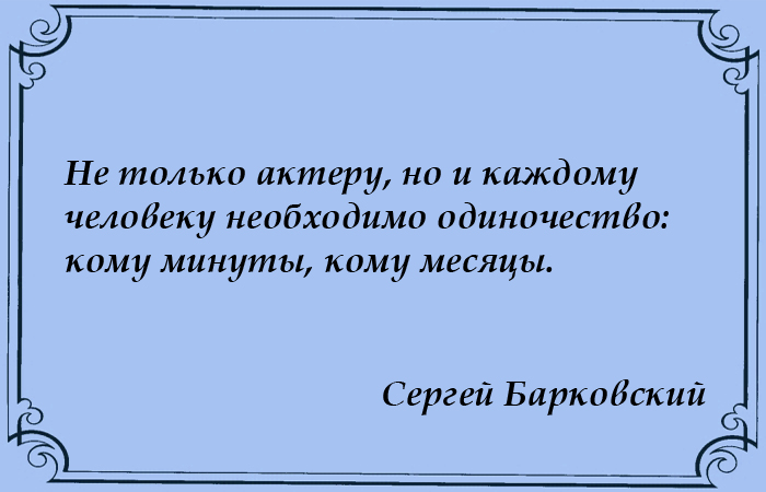 Сергей Барковский уверен: одиночество необходимо каждому человеку, чтобы понять себя, систематизировать собственные мысли, поставить какие-то цели или просто отдохнуть от общества. Сам он в одиночестве имеет возможность сосредоточиться, побыть наедине с ролью, поработать над ней и найти верный тон. Актёр обладает удивительной способностью создавать для себя одиночество даже в толпе. Бывало такое, что он настолько погружался в это состояние, что забывался, например, в вагоне метро и начинал повторять вслух роль. Другие пассажиры на всякий случай отсели подальше, решив, будто он пьяный или вовсе не совсем нормальный.