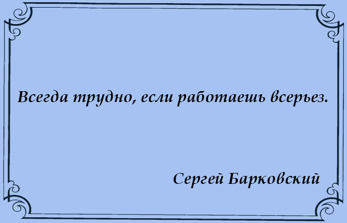Сергей Барковский – перфекционист, он привык всё, за что берётся, делать не хорошо, а отлично. Поэтому каждая новая работа для него – это новые сложности. Он уверен, что при наличии знаний и опыта можно сделать так, чтобы муза приходила к тебе строго по расписанию: в то время, когда звучит третий звонок, приглашающий зрителей в зал, или по команде «Приготовились, камера, мотор, начали!» Он работал со многими режиссёрами, снимался у Алексея Германа, Алексея Балабанова, Никиты Михалкова, Владимира Хотиненко и многих других режиссёров, у каждого из которых свои методы и видение материала. Работать с ними непросто, но, по мнению Сергея Барковского, это справедливо для всех профессий в том случае, если человек делает свою работу всерьёз. Он уверен: если работа в его случае идёт слишком легко, значит, он использует старые наработки. А настоящее искусство рождается в муках, самокопании, поисках.