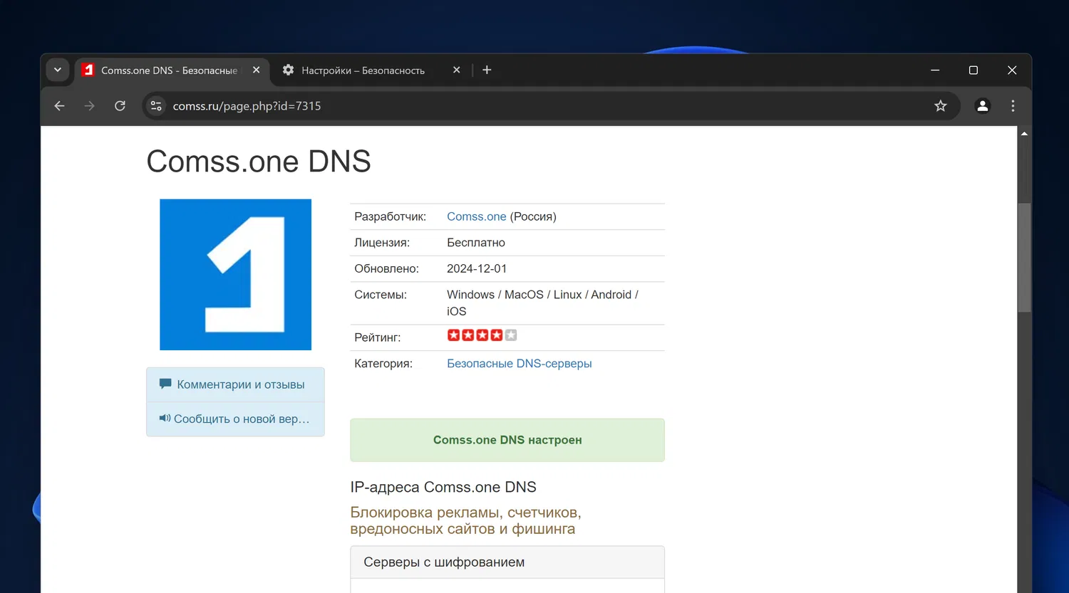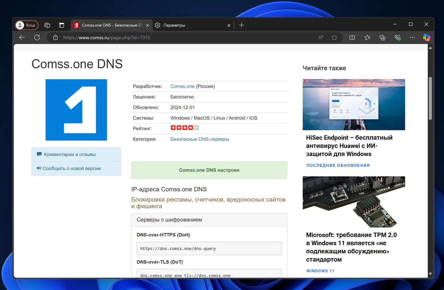 Теперь Microsoft Edge будет шифровать DNS-запросы через DoH, и вы получите доступ к ИИ-функциям. Для проверки правильной настройки перейдите на страницу Comss.one DNS.