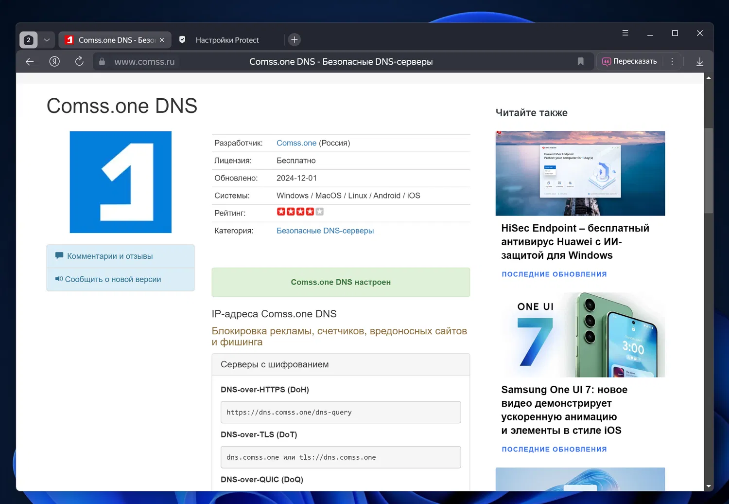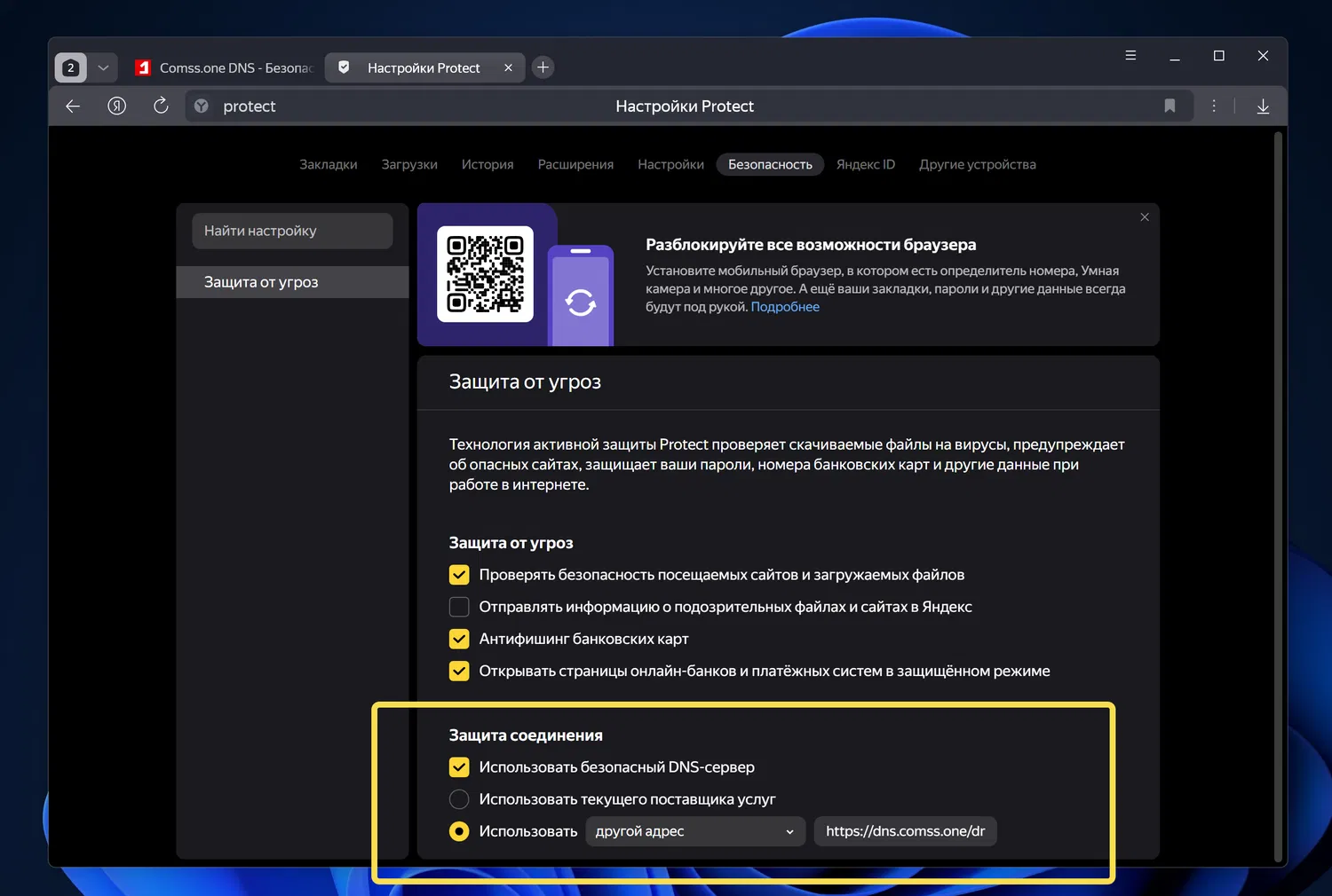 Яндекс.Браузер начнёт использовать DoH для защиты ваших данных и доступа к ИИ-сервисам. Для проверки правильной настройки перейдите на страницу Comss.one DNS.