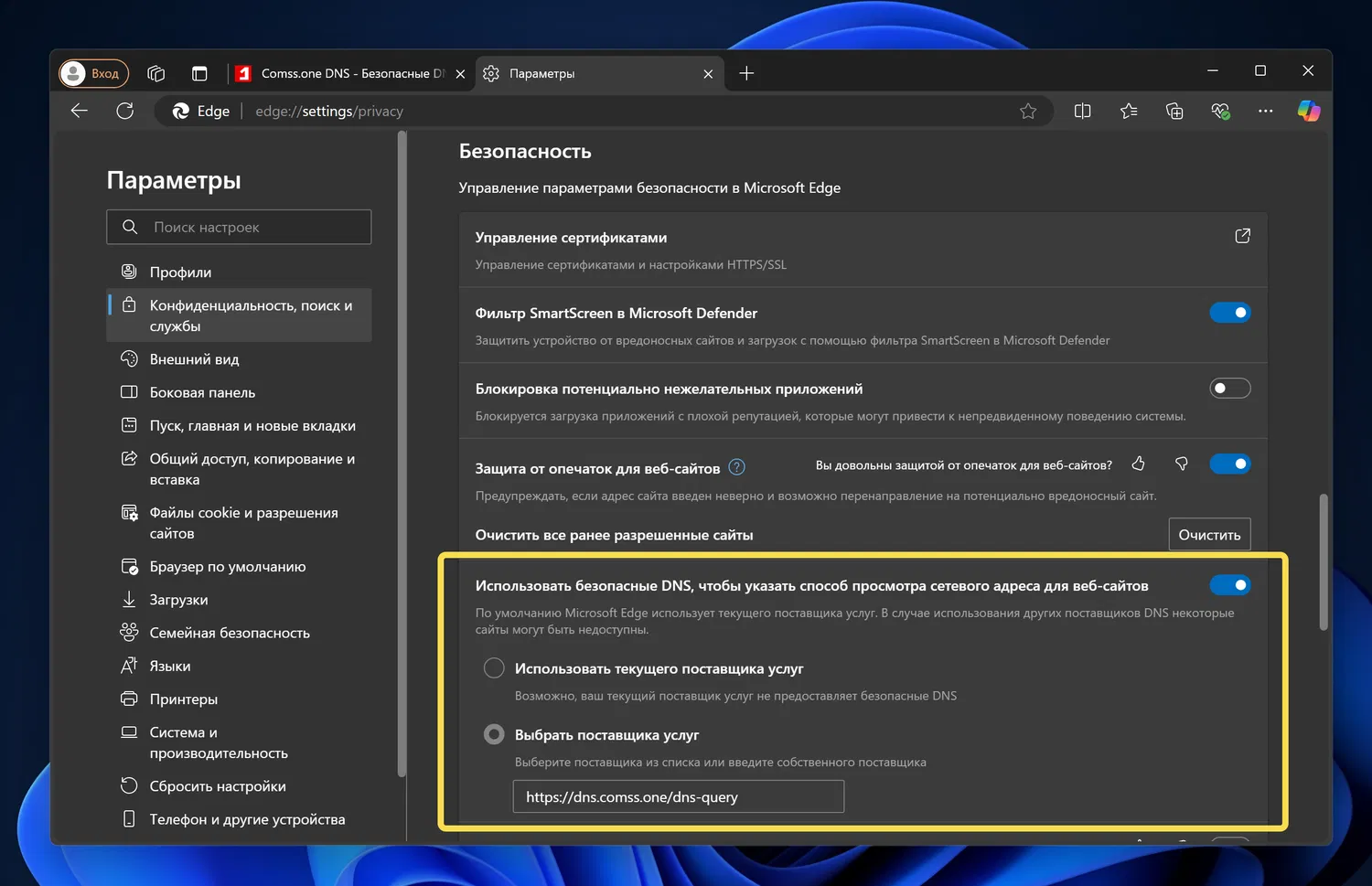В Microsoft Edge настройка DNS-over-HTTPS выполняется следующим образом: