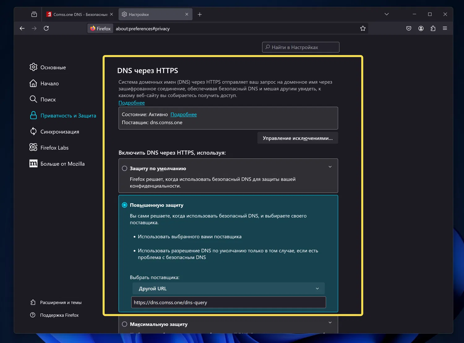 После сохранения настроек браузер Firefox будет использовать DNS-over-HTTPS для шифрования запросов и доступа к ИИ-сервисам. Для проверки правильной настройки перейдите на страницу Comss.one DNS.