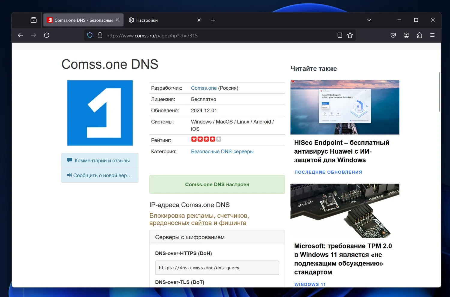 После выполнения настроек ваш браузер будет использовать DNS-over-HTTPS для шифрования DNS-запросов и доступа к ИИ-функциям и сервисам. Для проверки правильной настройки перейдите на страницу Comss.one DNS.