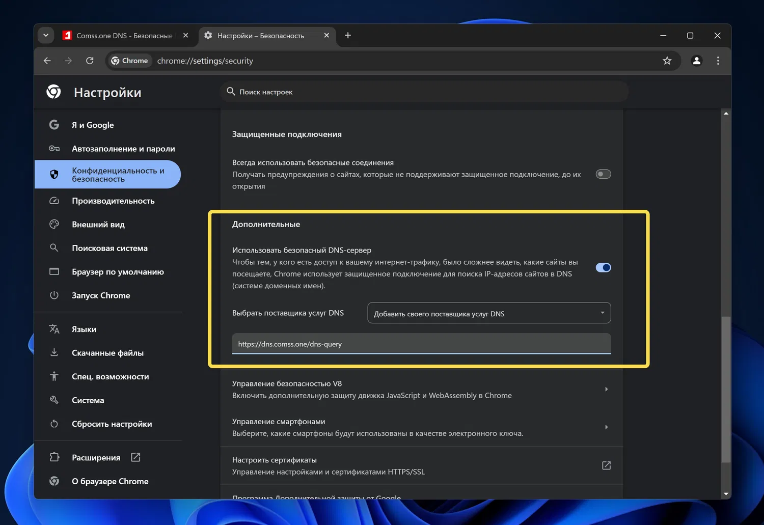 ). - Включите опцию Использовать безопасный DNS-сервер.