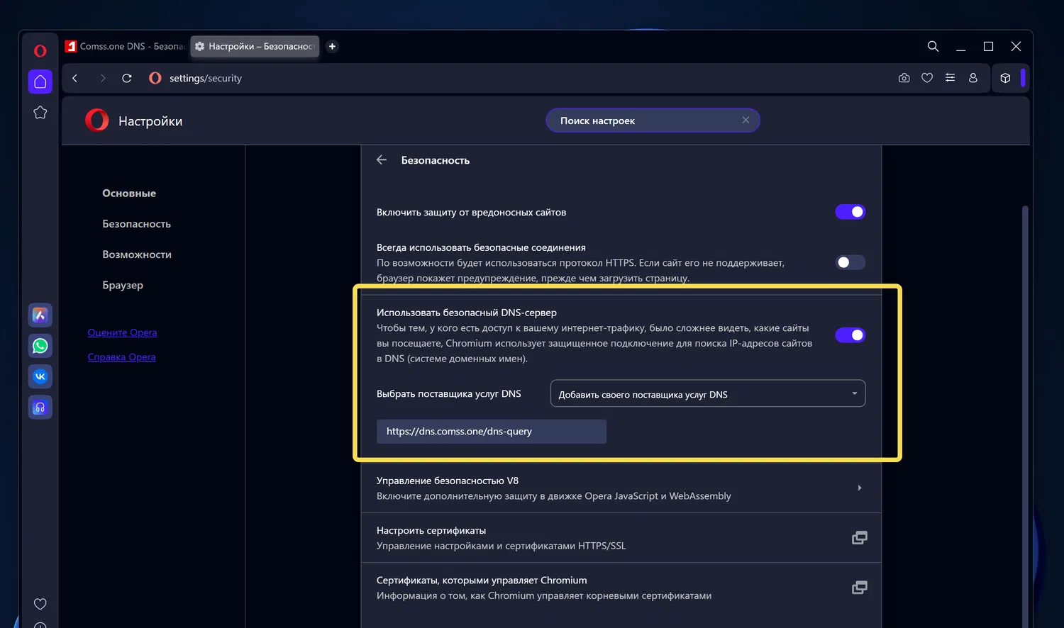 Для настройки DNS-over-HTTPS в браузере Opera выполните следующие шаги: