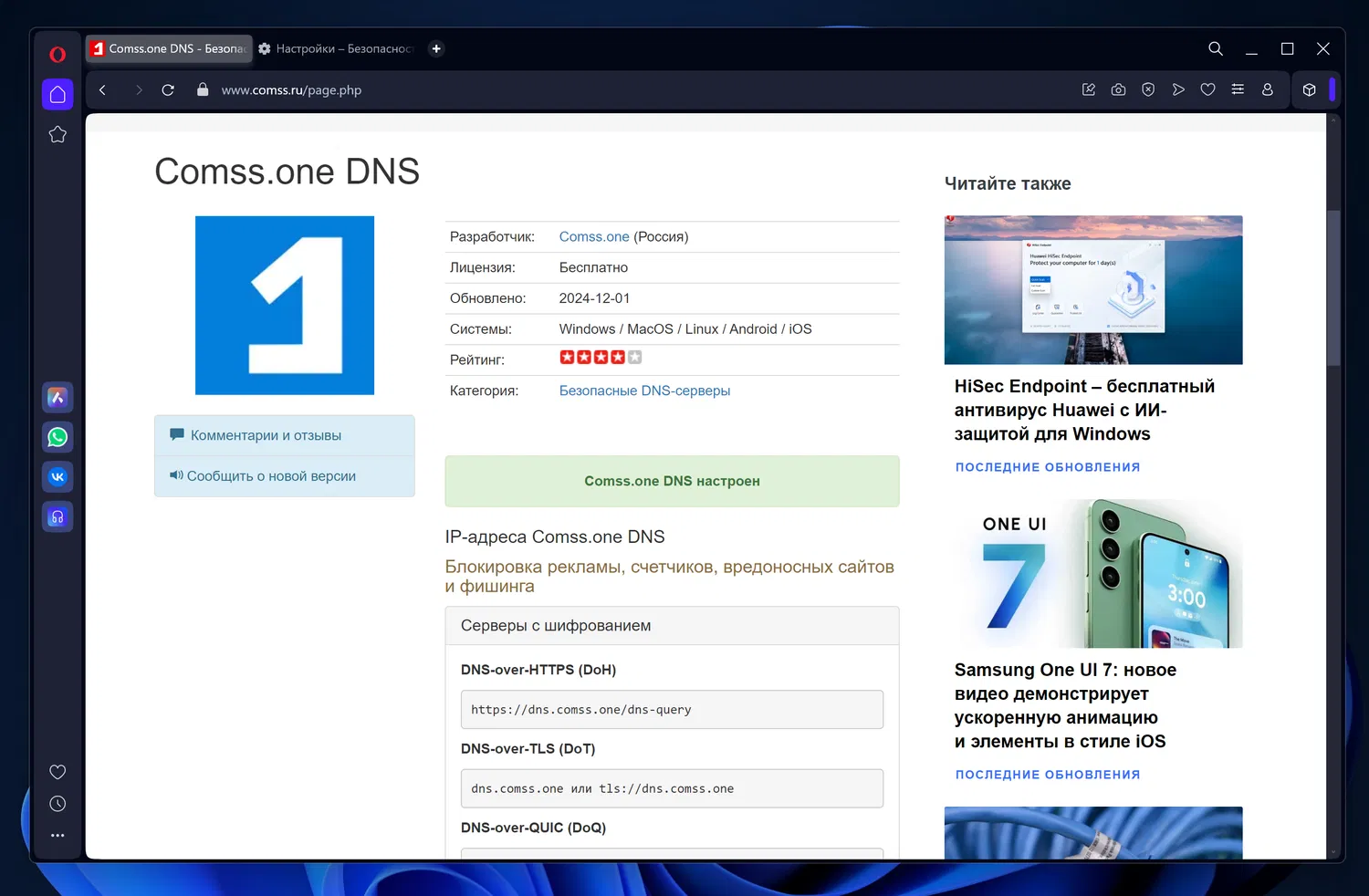 Opera начнёт использовать DoH для повышения вашей конфиденциальности и доступа к ИИ-функциям. Для проверки правильной настройки перейдите на страницу Comss.one DNS.