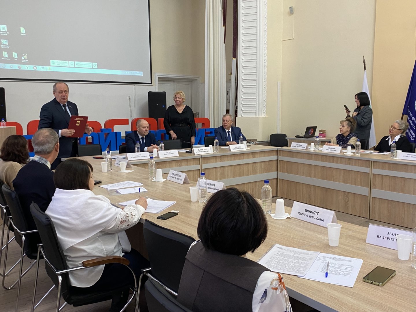 Во время торжественной части заседания Комитета председатель комиссии по поощрениям Андрей Голоус вручил награду Тюменской городской Думы.