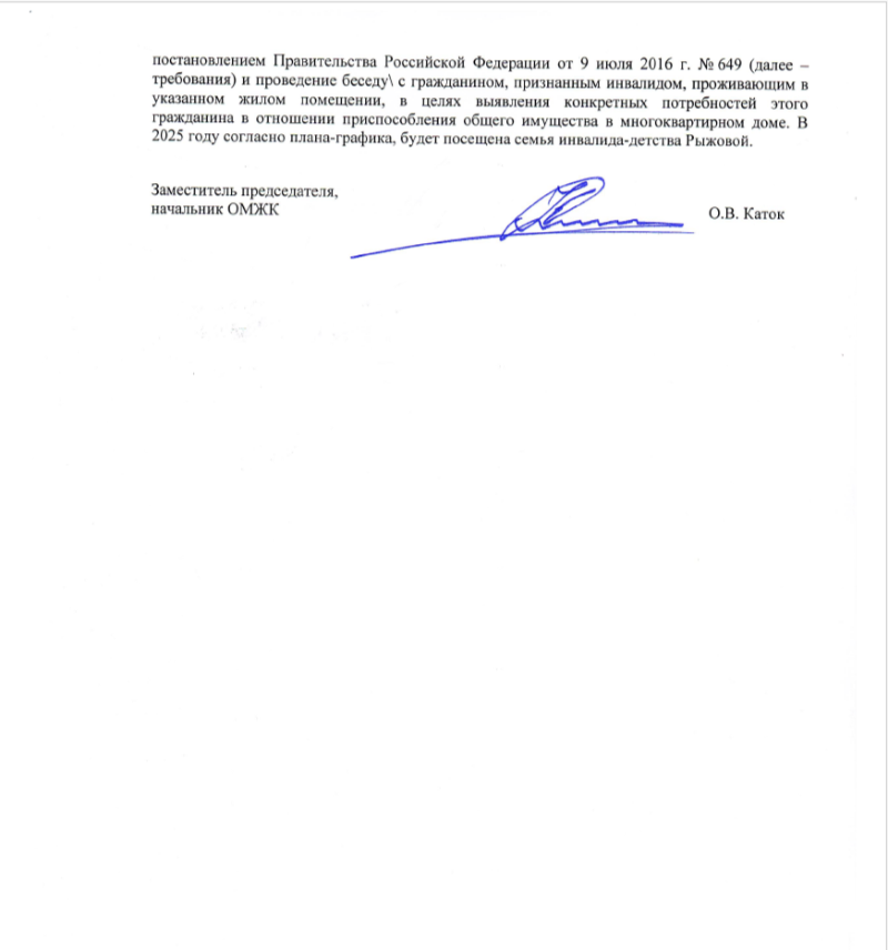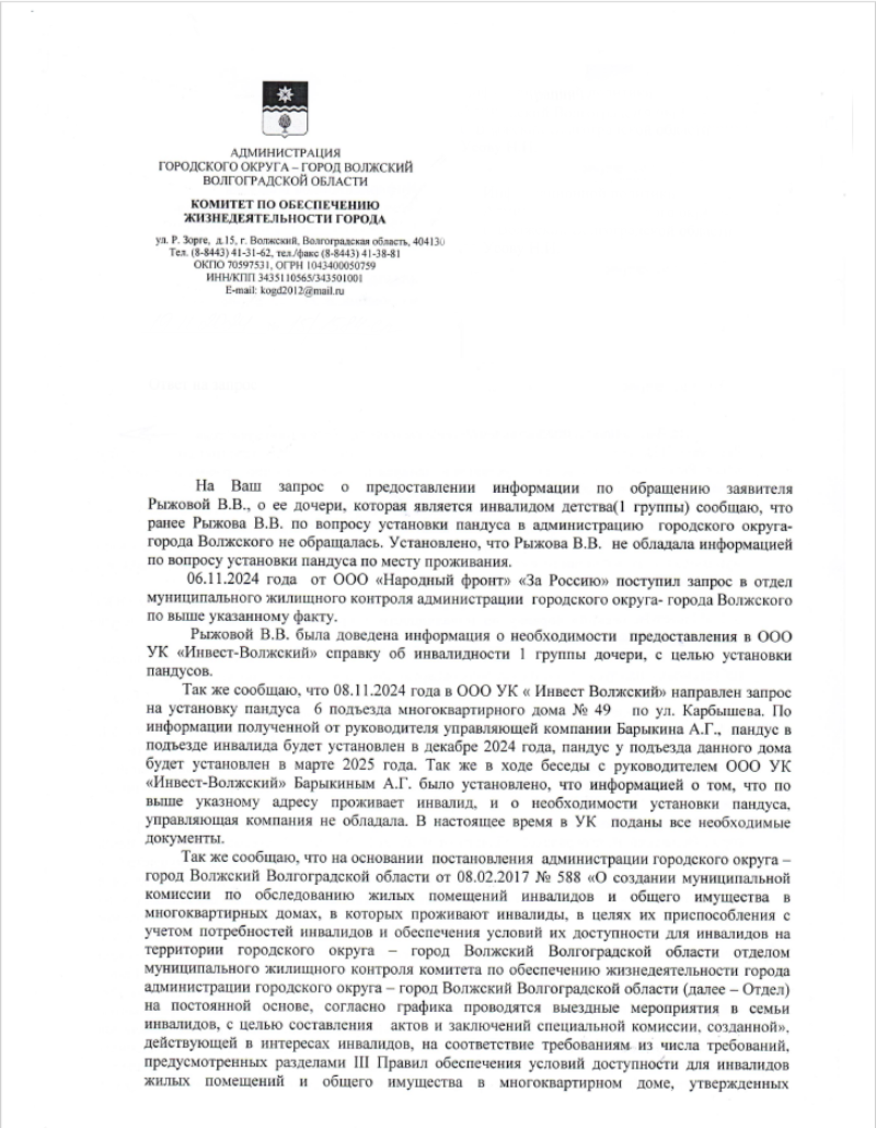 В итоге семья Рыжовых смогла добиться установки пандуса для удобства. Администрация города Волжского предоставила ответ на наш вопрос о судьбе семьи Рыжовых и их дочери, которая является инвалидом с детства. В администрации сообщили, что управляющая компания планирует установить пандус в подъезде в ближайшее время, а именно в декабре, точное число не уточнялось. А вот пандус у подъезда дома установят только в марте следующего года.Корреспондент редакции «Блокнот Волжский» связался с Валентиной Рыжовой, чтобы уточнить, установили ли волжанам долгожданный пандус в подъезде. Оказывается, что еще нет. Валентина сообщила, что совсем недавно сроки перенесли на 28 декабря. А также заявили, что пандус уже куплен.