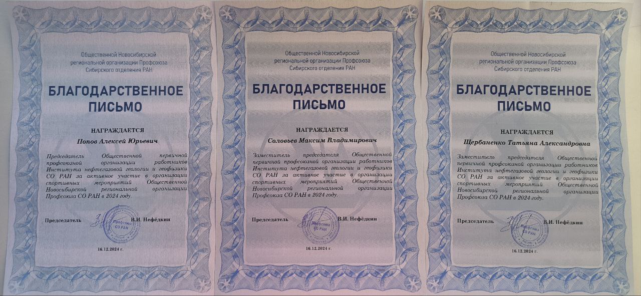 16 декабря 2024 г. на общем собрании Профсоюза СО РАН состоялось торжественное награждение победителей и призеров Спартакиады. Кубок за 2 место и благодарственные письма вручены председателю Профсоюза ИНГГ СО РАН –Попову Алексею Юрьевичуи спортивным организаторам Щербаненко Татьяне Александровне и Соловьеву Максиму Владимировичу.