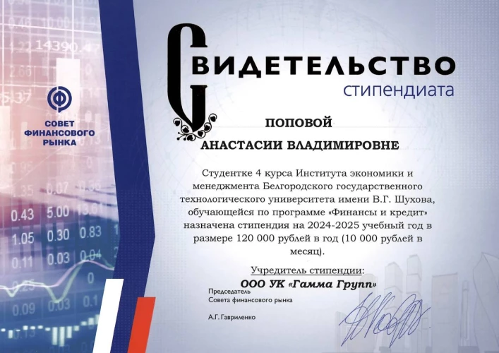 Студентка института экономики и менеджмента Анастасия Попова стала участником именной стипендиальной программы Совета финансового рынка (оператор — Ассоциация «НП РТС»). Учредителем стипендии выступила компания ООО УК «Гамма Групп».