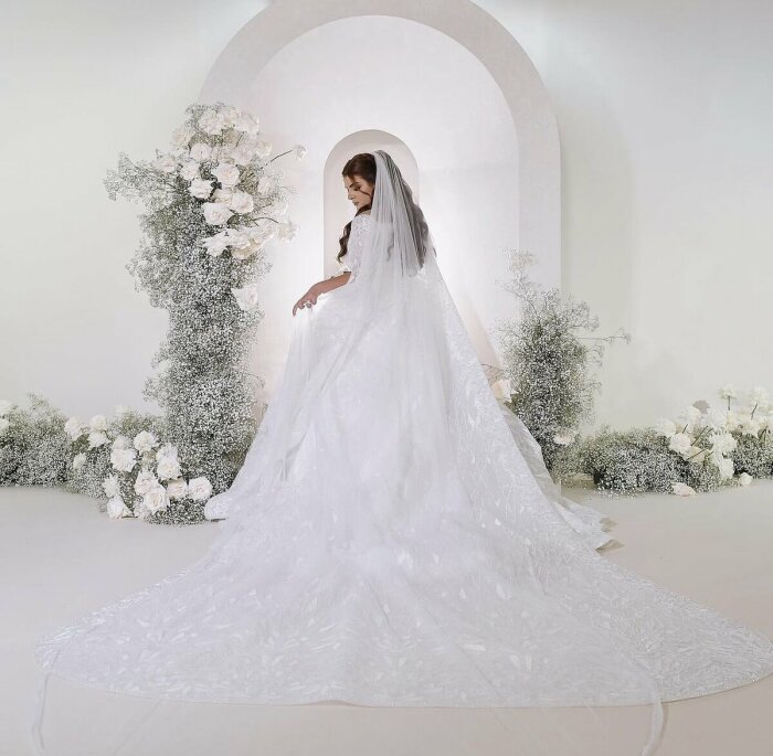 Свадьба такой роскошной девушки не могла быть никакой иначе, кроме как сказочной. Церемония проходила В Дубае. На Махре было шикарное белоснежное платье с фатой и шлейфом от Ezra Couture сшитое на заказ. В качестве украшений она надела крупное бриллиантовое ожерелье.