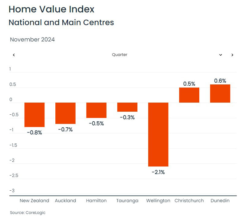 Келвин Дэвидсон охарактеризовал рынок Новой Зеландии как нестабильный. «После первоначального роста цен в начале года, вызванного настроениями после выборов в конце 2023 года, цены на недвижимость быстро возобновили снижение, поскольку выросла безработица, а снижение процентных ставок было отложено», – пояснил он.