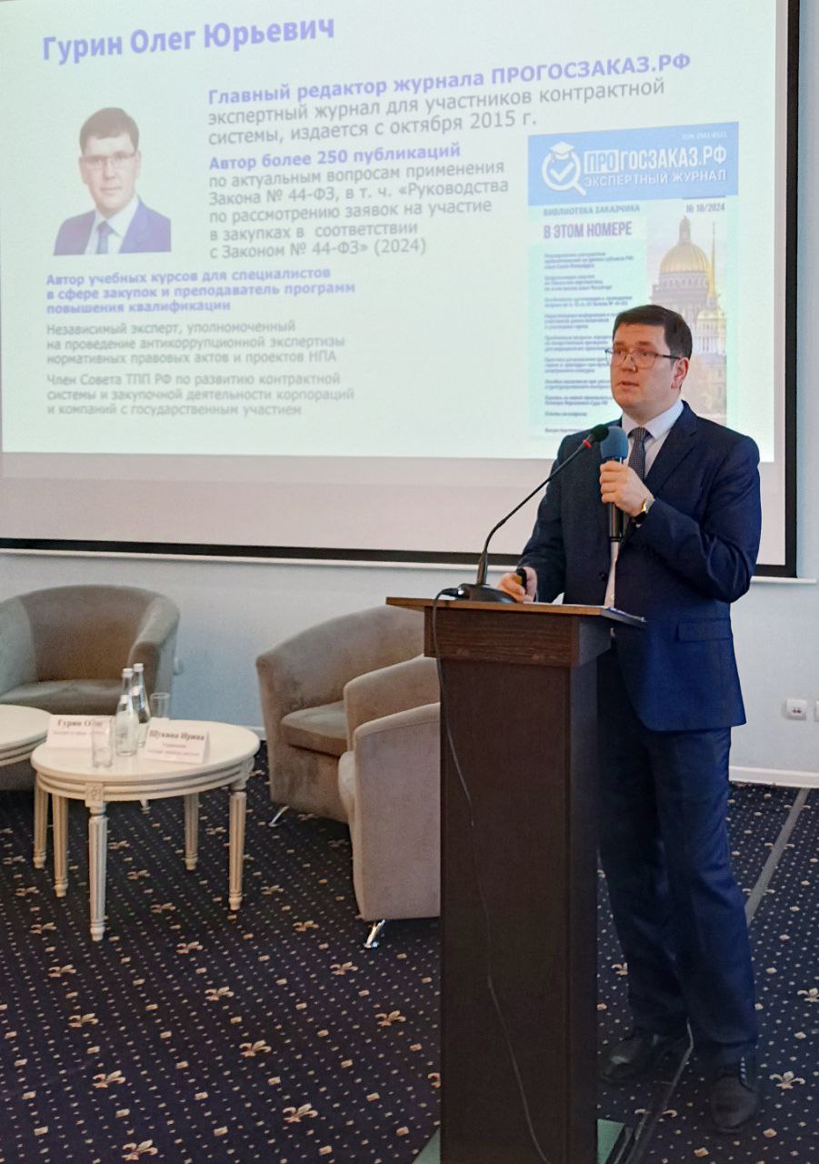 Олег Гурин, главный редактор журнала «Прогосзаказ.РФ», член Совета ТПП России по развитию системы закупок, выступил с докладом по теме «Изменения в нормативном регулировании, развитие правоприменительной практики в контрактной системе в сфере закупок – 2024/2025 годах» и осветил вопросы национального режима импортозамещения при осуществлении закупок в 2025 году. При ответах на вопросы рассказал о часто встречающихся нарушениях со стороны заказчиков по заключению дополнительных соглашений по контрактам без веских оснований, несоблюдению сроков оплаты по исполненным контрактам.