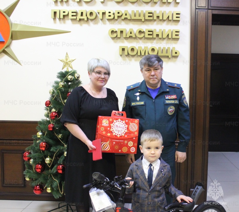 Сын героя - маленький Егор – мечтал о детском велосипеде. Сегодня его желание исполнилось: у новогодней елки в Главном управлении МЧС России по Белгородской области ему вручили долгожданный подарок. Новогодний сюрприз, который подготовили сотрудники МЧС России, очень обрадовал маленького Егора, ведь он получил то, что очень просил у Дедушки Мороза, а в придачу к этому еще и сладкий подарок.